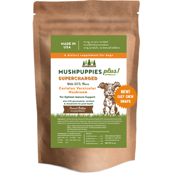 Easy to chew and snaps in two! Introducing our newest breakthrough in functional pet supplements—Easy Chew Snaps MushPuppies Plus! Specially formulated for dogs with sensitive teeth or chewing difficulties, these thinner, softer chews are designed to snap in half with ease, giving pet parents flexibility. Now with a darker color and slimmer shape—they deliver the same trusted benefits as our original MushPuppies Plus, including Coriolus Versicolor for powerful immune support, plus Chondroitin, Glucosamine, and Carotene for joint and bone health. That’s 50% more Coriolus Versicolor than our standard MushPuppies, in a more convenient and accessible form, because every dog deserves wellness made easy.